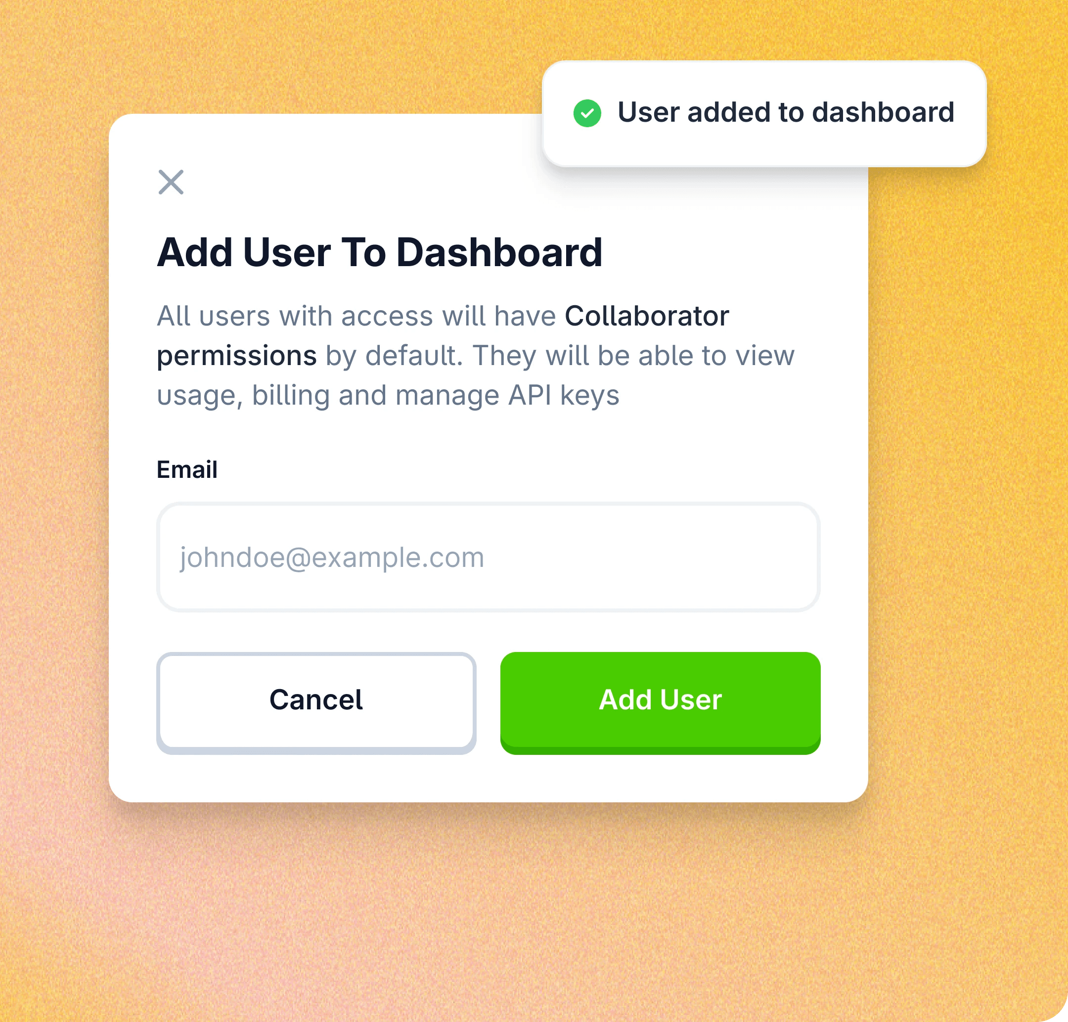 Invite teammates to a shared developer dashboard as Collaborators via email, so they can manage API keys, view usage logs and billings easily